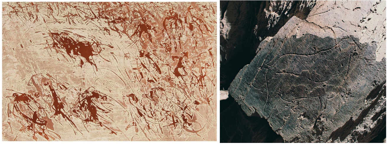 À esquerda uma das obras expostas de Júlio Pomar e à direita uma das gravuras rupesyres do Côa