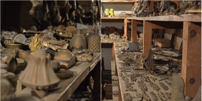 Uma bancada da oficina da Casa Achilles, onde se podem ver alguns exemplares obtidos pela fundição em molde de areia. Na foto de abertura, a sala de entrada com alguns escaparates.